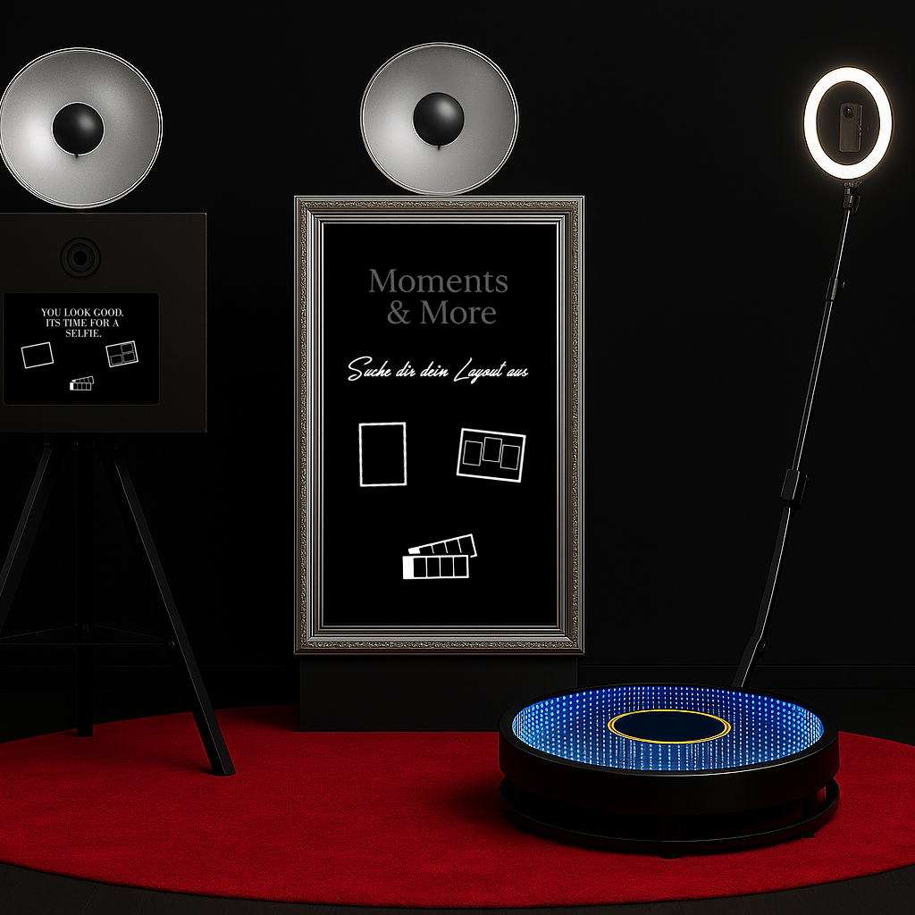 Ob Hochzeit, Geburtstag, Firmenfeier oder Messe – unsere Eventlösungen schaffen echte Erlebnisse und hochwertige Erinnerungen. Von klassischen Fotobox Momenten mit Sofortdruck und Online Galerie bis hin zu interaktiven Wow Effekten mit Fotospiegel und 360° Videobooth.